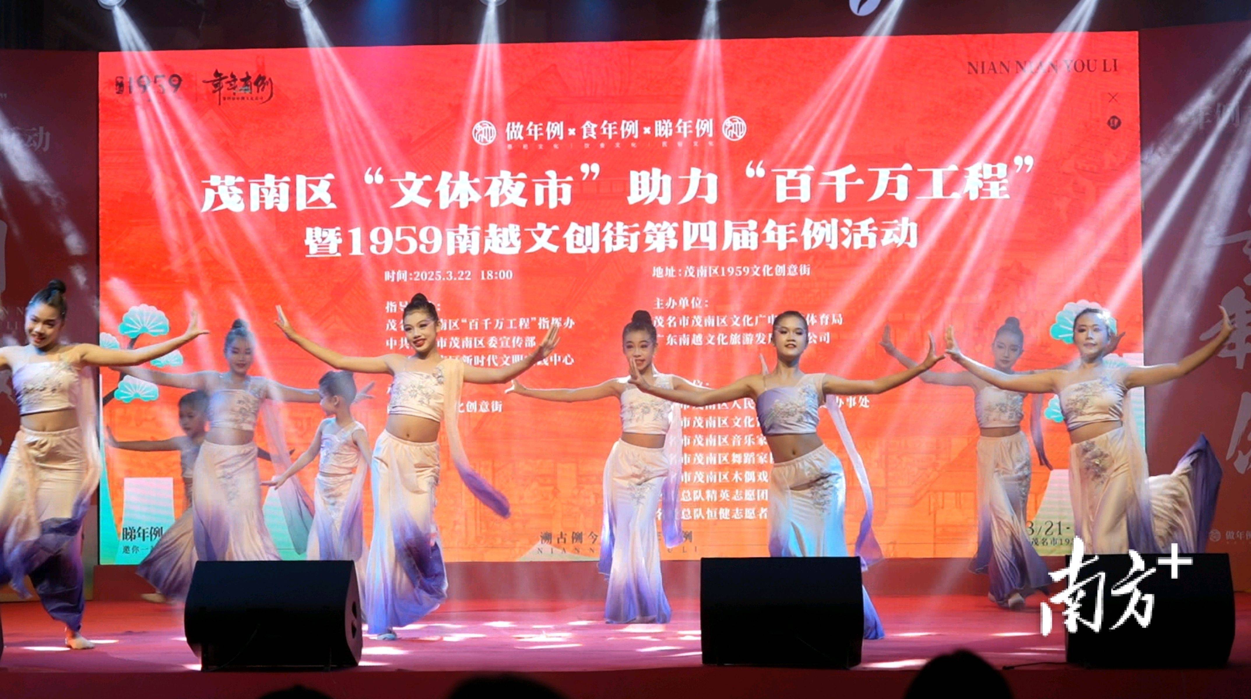 在1959文创街启动的茂南区“文体夜市”助力“百千万工程”暨第四届年例文化活动,以“年例+非遗”“年例+助学”“年例+高凉菜”“年例+文化”“年例+夜经济”的多元融合形式,为市民游客带来沉浸式民俗体验。