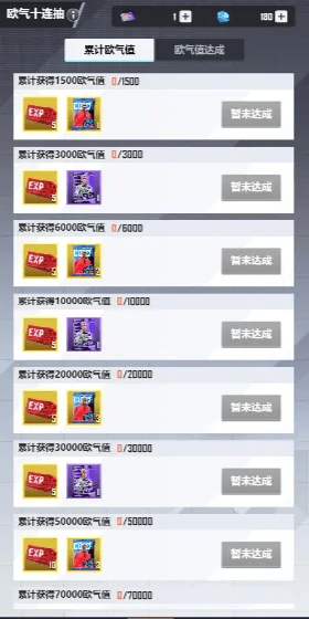 每一次十连抽都将获得欧气值,当您累计获得欧气值达到一定数量,或是单次欧气值达到指定数量时,即可在欧气成就页面兑换好礼!