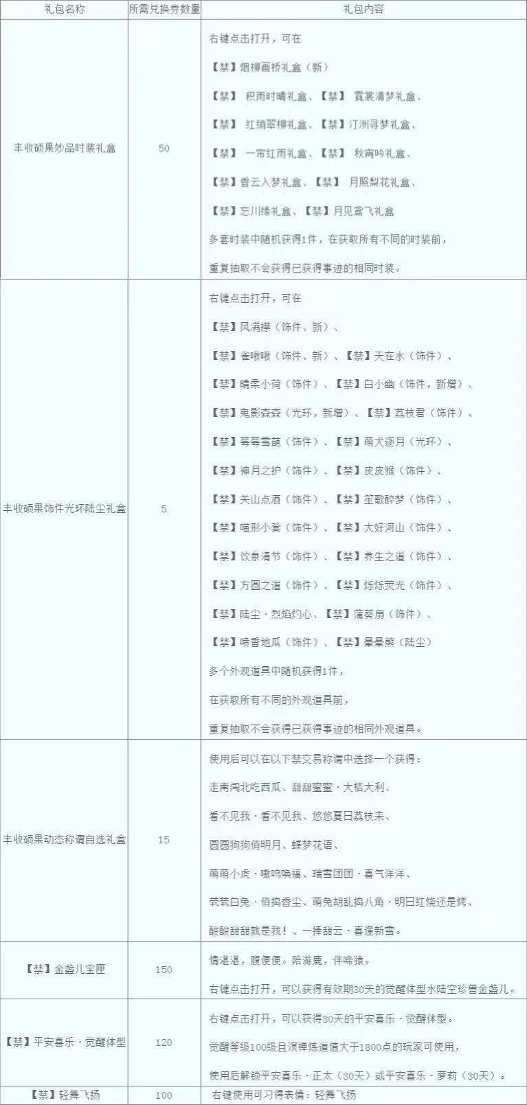 兑换规则:活动时间内,使用丰收硕果外观兑换券,可在奖励兑换界面(点击丰收硕果界面“奖励兑换”按钮进入)兑换各类外观礼包